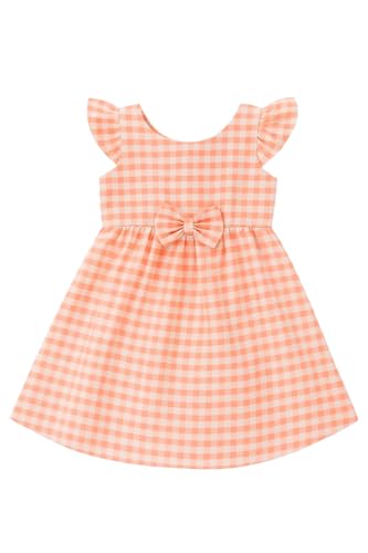 Generic - فستان أطفال بنقشة مربعات وردية، بأكمام مكشكشة، مع فيونكة عند الخصر، لون سلموني