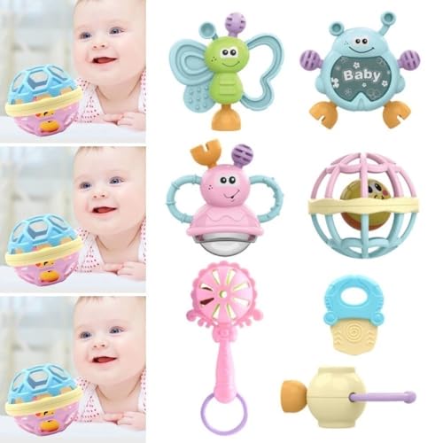 Generic - خشخيشات وألعاب الاطفال، 7 قطع، صندوق تخزين، مناسبة للاطفال من عمر 3 اشهر، الفراشات والمخلوقات المبتسمة، مادة امنة للاطفال من فانتاستيك كيدز تويز (رمادي)