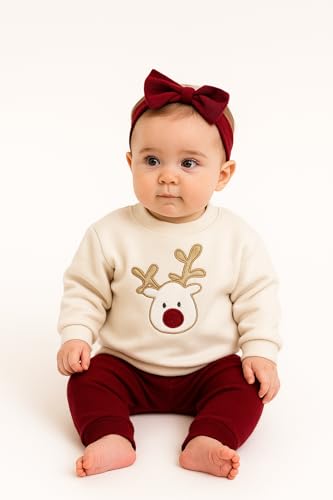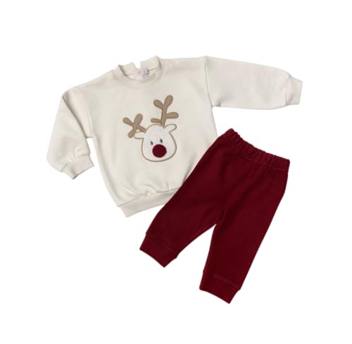 baby club - طقم ملابس حيوان الرنة للأطفال، سويت شيرت أبيض مع بنطلون أحمر، طقم ملابس شتوية من 2 قطعة