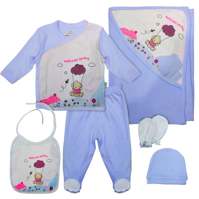 Baby Shoora - طقم للأولاد حديثي الولادة مكون من تيشرت بأكمام طويلة وبنطلون وقبعة ومريلة وقفازات وبطانية، تصميم مطرز بنقشة دب (عبوة من قطعة واحدة)