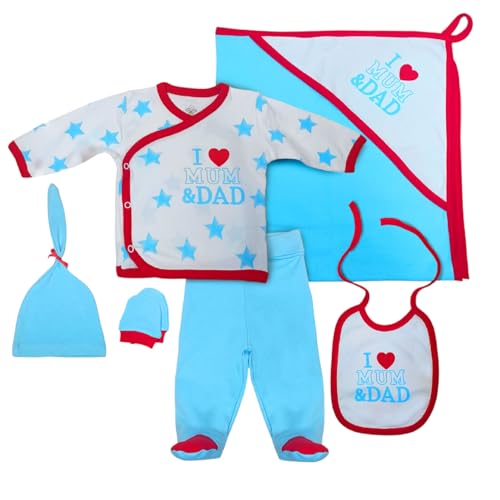Baby Shoora - طقم للأولاد مكون من 6 قطع مكون من تيشرت بأكمام طويلة وسروال ومريلة وجوانتي وقبعة وبطانية مطبوعة للنوم للأطفال الصغار من بيبي شورا (عبوة من 6 قطع)