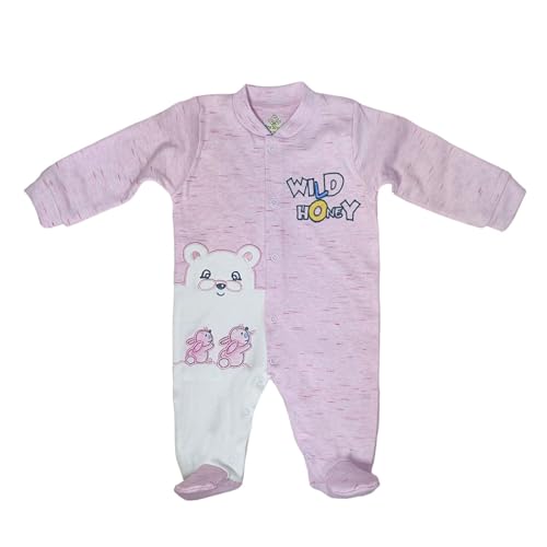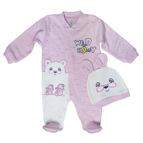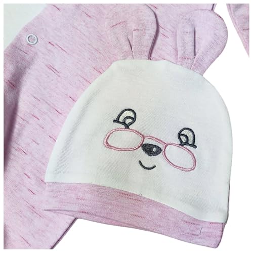 Baby Shoora - سالوبيت قطن من بيبي شورا بكباسين وأكمام طويلة مع طاقية مطرزة برسمة أرنب للبنات حديثي الولادة 0-3 أشهر، بلون وردي وأبيض