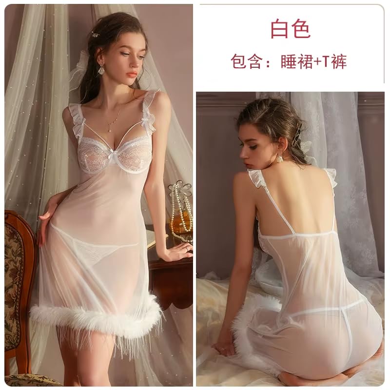 Generic - بيبي دول لانجري حريمي تل شفاف، فستان نوم مثير بدانتيل وريش، مقاس موحد (يلبس من 60 إلى 85 كجم)