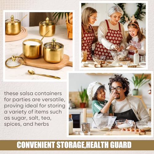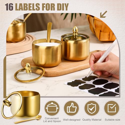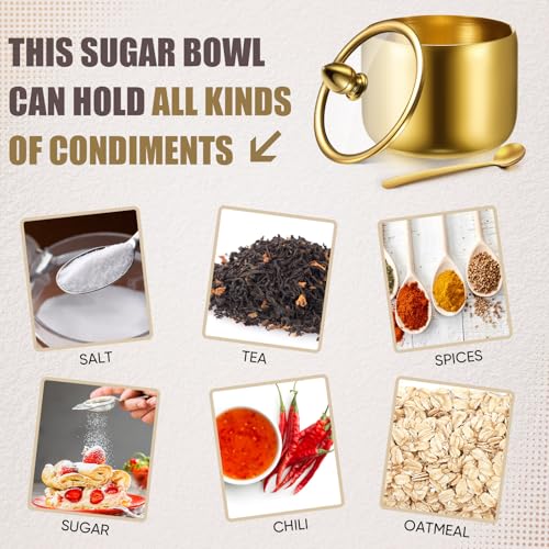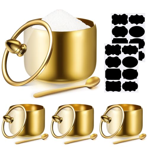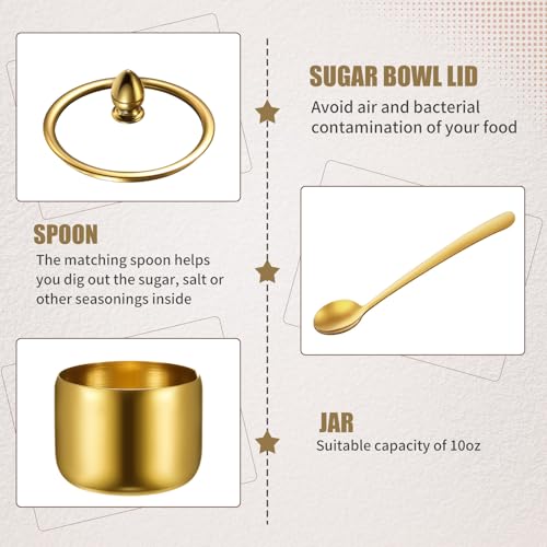 Baderke - وعاء سكر من الفولاذ المقاوم للصدأ سعة 290 مل من 4 قطع من بادريك، وعاء سكر ذهبي مع غطاء وملعقة مع بطاقة تعريف للتوابل والقهوة والشاي والفلفل والأعشاب