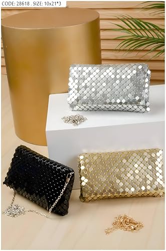 Generic - شنطة سهرة فاخرة بتصميم شبكي معدني مع حزام سلسلة قابل للفصل، باللون الذهبي اللامع والفضي والاسود، مقاس 21 × 10 سم، مصممة للاناقة والمناسبات الخاصة (موديل 1)
