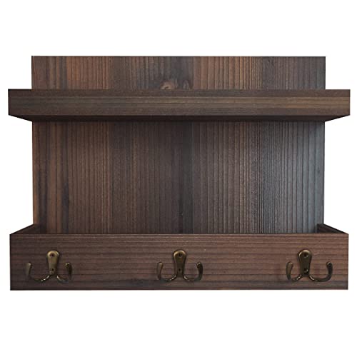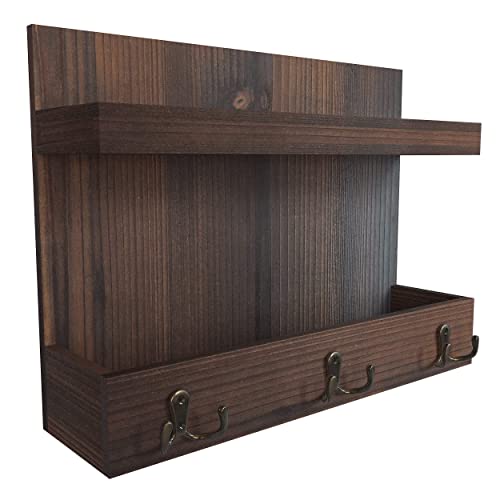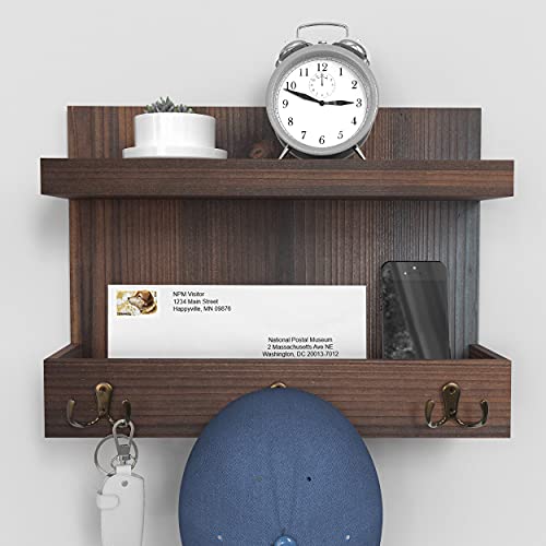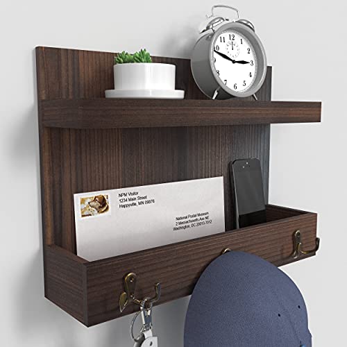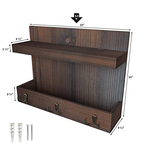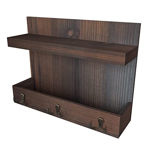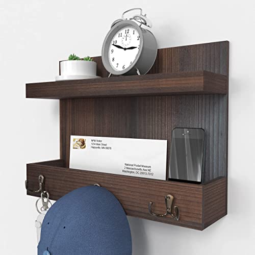 Ballucci - بالوتشي منظم مدخل يثبت على الحائط للبريد والجوالات والمفاتيح مع رف تخزين عائم و3 خطافات مفاتيح معدنية، 15 × 11 انش - خشب البلوط الداكن الريفي، بني