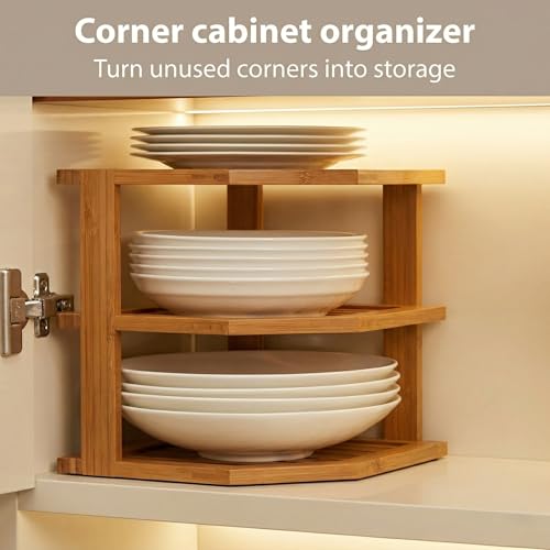 - منظم رفوف أطباق من الخيزران مكون من 3 أرفف - مصنوع يدويًا من الخيزران الفاخر، منظم خزانة الزاوية الجميل هذا قوي وصديق للبيئة وطبيعي يكمل أي مطبخ عصري.