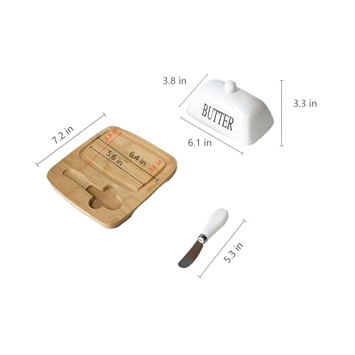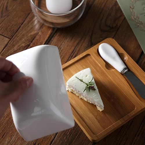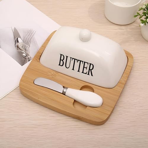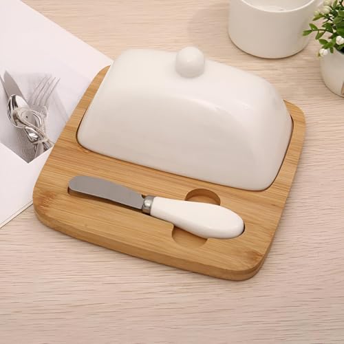 Generic - طبق بقاعدة من الخيزران - حامل زبدة بورسلين انيق على قدم خشبية متينة من الخيزران، يتضمن سكين حاد من الستانلس ستيل، امن بالكامل للاستخدام في الميكروويف، مستورد عالي الجودة لأدوات المائدة المتطورة.