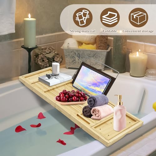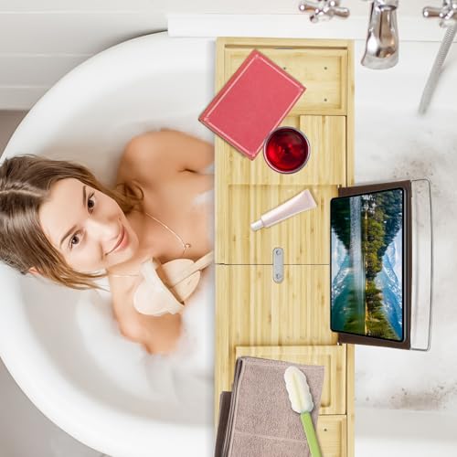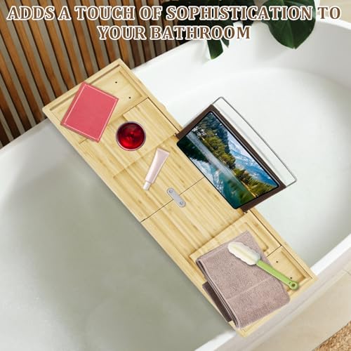 ZJMCAJY - صينية حمام من الخيزران، صينية حوض استحمام قابلة للطي وقابلة للتوسيع للكتب والتابلت وكؤوس النبيذ، صينية حوض استحمام قابلة للطي، صينية طاولة حمام خشبية متينة مع جوانب قابلة للتوسيع للحمام