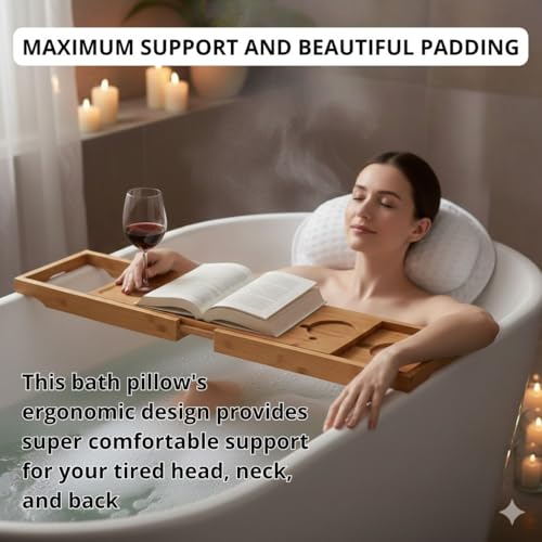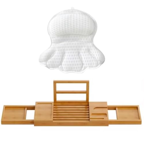 DOWAM - طقم مخدة وصينية حمام من الخيزران: صينية حوض استحمام قابلة للتعديل ومخدة مريحة للرقبة والظهر مزودة بشبكة رباعية الأبعاد ومزودة بمسامات للتهوية مع قواعد لاصقة مانعة للانزلاق ومقاومة للماء.