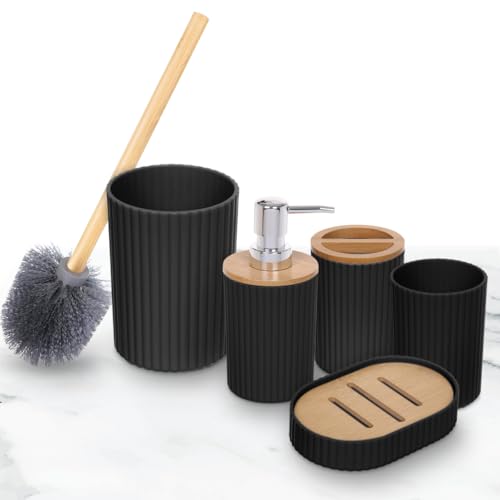 Generic - أكسسوارات حمام مستديرة من البامبو، فرشاة تواليت مع حامل، طبق صابون وموزع لوشن لتنظيم الحمام العصري، 5 قطع (أسود)