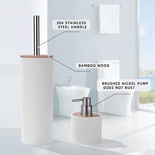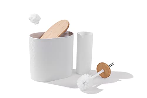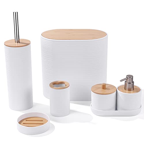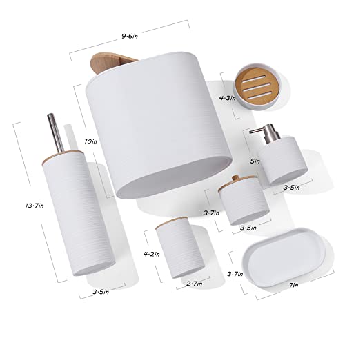 YAUKPH - مجموعة اكسسوارات حمام من الخيزران مع سلة مهملات وصينية زينة وكوب وحامل عيدان وموزع صابون وطبق صابون وفرشاة تواليت، لون أبيض