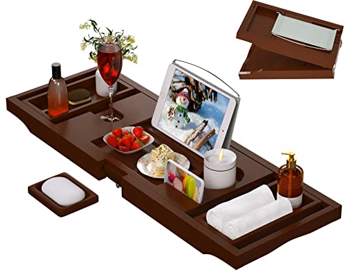 Youpehom - صينية حوض استحمام من الخيزران قابلة للتوسيع للحمام الفاخر، ملحقات الحمام والطاولة مع حامل كؤوس النبيذ، منظم حمام وحامل كتب مع جوانب ممتدة للرجال/النساء، بني