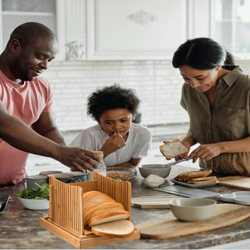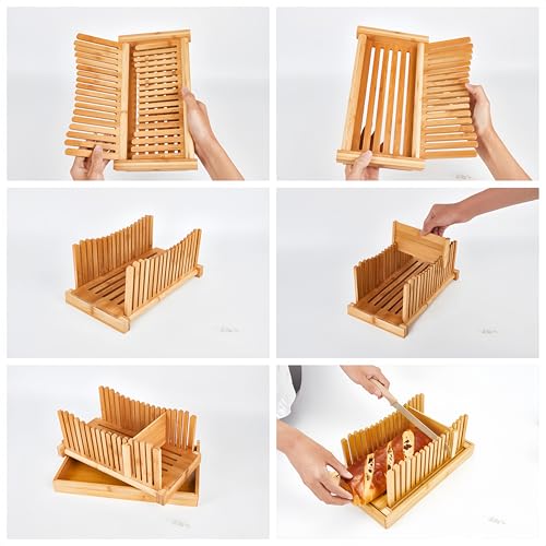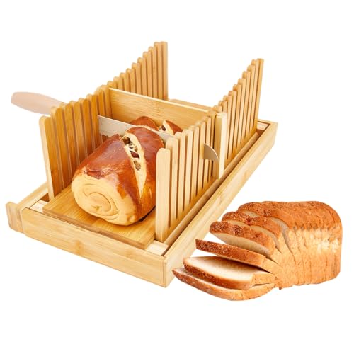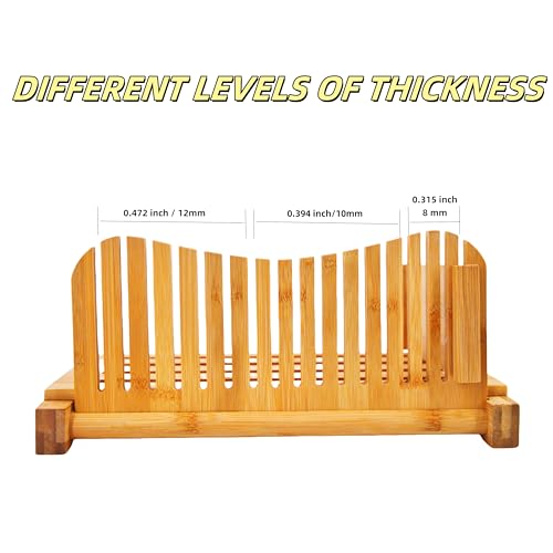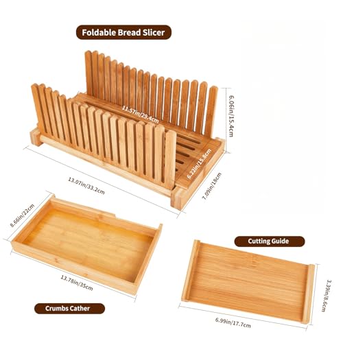 TecfdAssist - قطاعة خبز من الخيزران للخبز المنزلي مع صينية فتات الخبز ودليل تقطيع الخبز، لوح تقطيع مع حامل سكاكين مغناطيسي بسمك قابل للتعديل، قطاعة خبز قابلة للطي