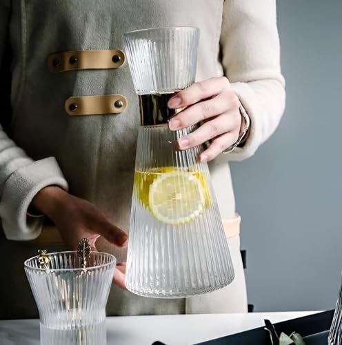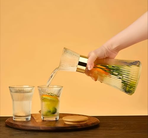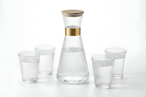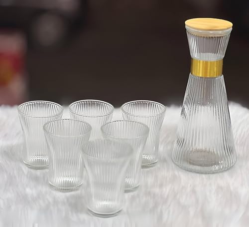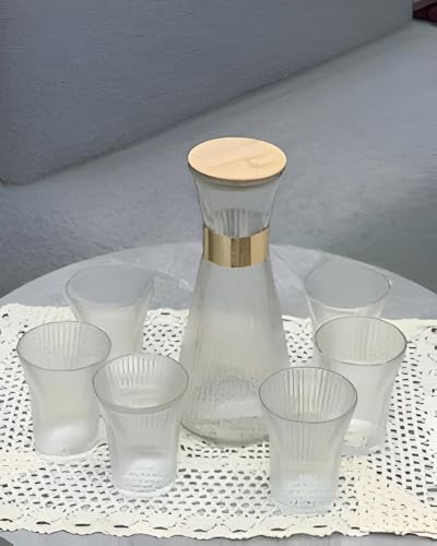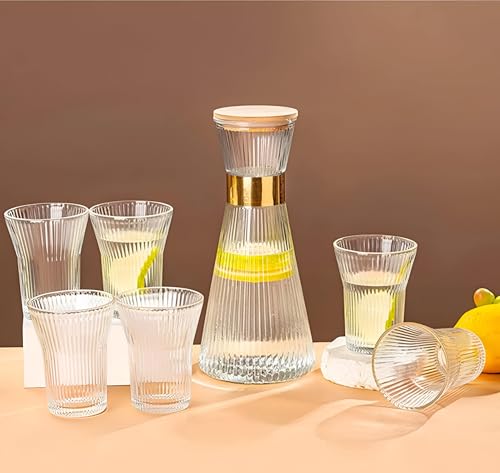 Generic - طقم زجاجة بغطاء من البامبو بسعة 1 لتر مع 6 أكواب متطابقة، مصنوع من الزجاج بلمسة نهائية مضلعة من الكريستال الشفاف