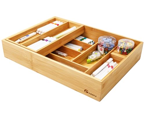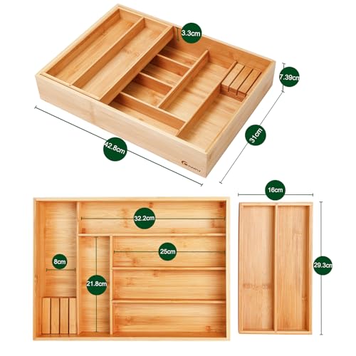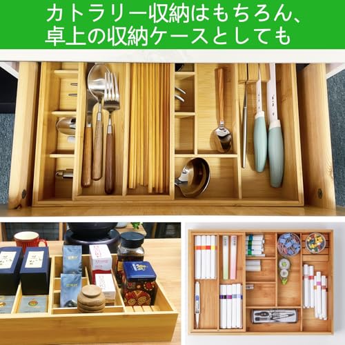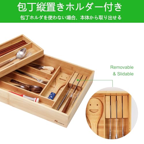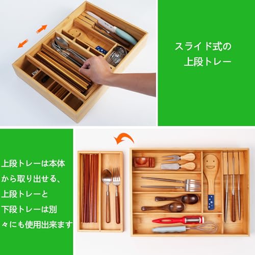 COIWAI - حافظة أدوات مائدة من البامبو، منظم درج المطبخ، نوع منزلق، عبارة عن صينية من طبقتين، تتضمن حامل أدوات المائدة، صندوق تخزين صغير، صندوق أدوات مائدة عميق مضاد للبكتيريا، مصنوع من البامبو مقاس كبير