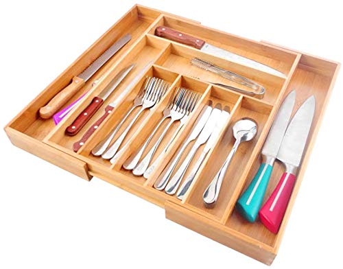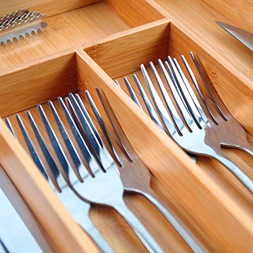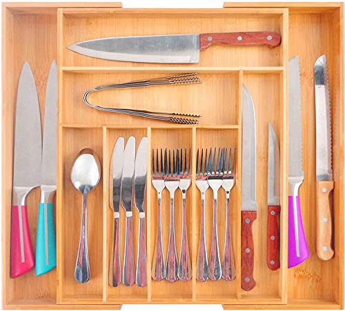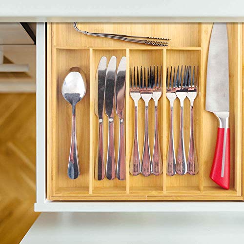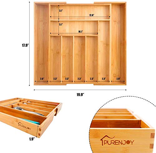 PURENJOY - صينية أدوات مائدة من الخيزران قابلة للتوسيع، منظم أدراج قابل للتعديل من 7-9 أقسام للمطبخ وغرفة النوم والحمام والمكتب وما إلى ذلك (45.5 × 36 × 3 سم، بامبو)