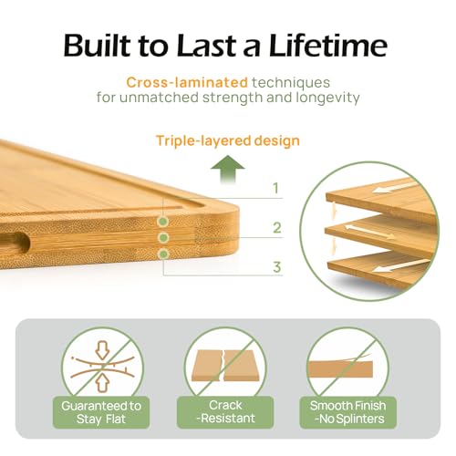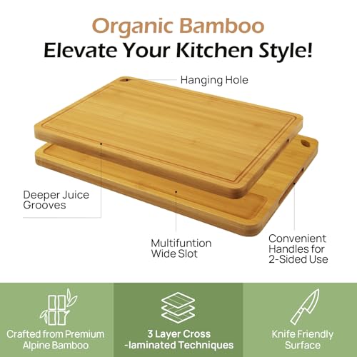 - لوح تقطيع من الخيزران، ألواح تقطيع خشبية متينة للمطبخ مع أخاديد عصير عميقة ومقابض مدمجة، مثالية لتقطيع اللحوم