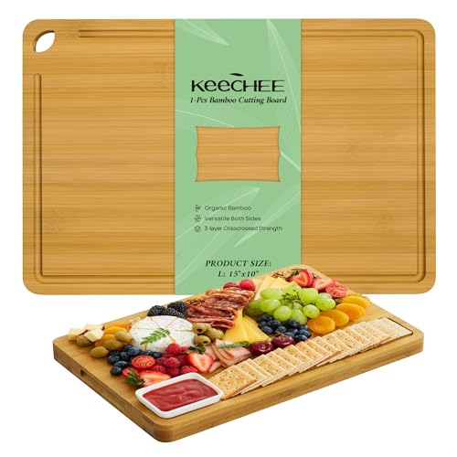 keechee - لوح تقطيع من الخيزران، الواح تقطيع خشبية متينة للمطبخ مع اخاديد عصير عميقة ومقابض مدمجة، مثالية لتقطيع وتقطيع (خيزران طبيعي، طول 15 انش × عرض 10 انش)