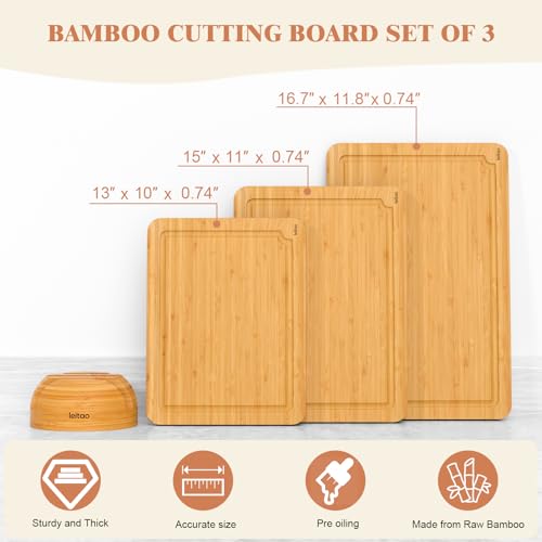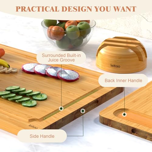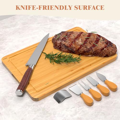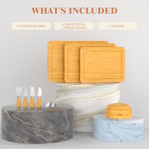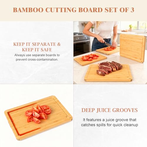 KEGDAN - لوح تقطيع من الخيزران للمطبخ، لوح تقطيع خشبي مع 4 سكاكين وواقي للأصابع، أخدود ومقابض للعصير، لوح تقطيع للحوم الباردة، أدوات مطبخ (مجموعة من 3 قطع)