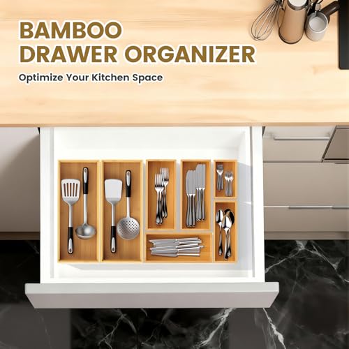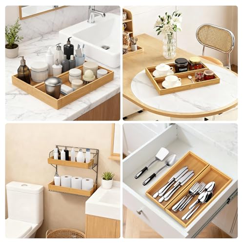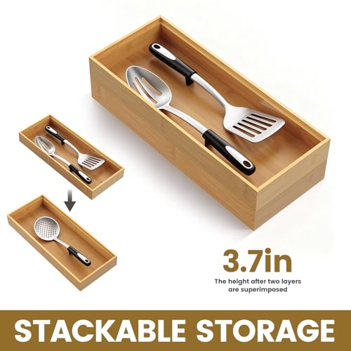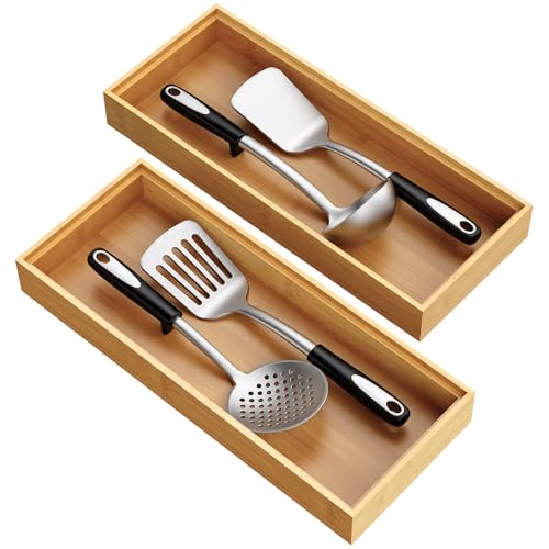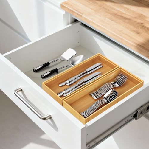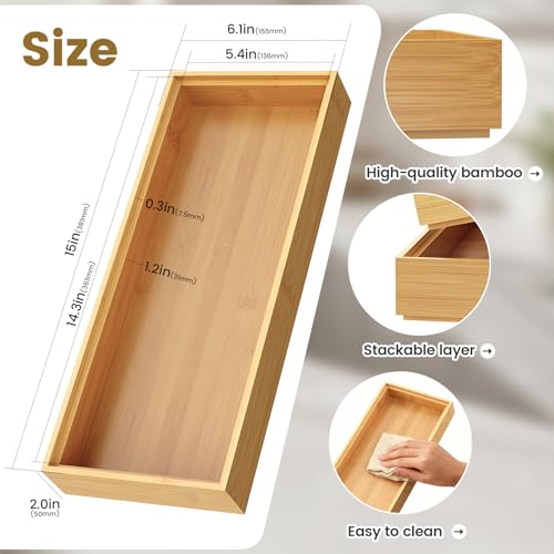 Bayting - مجموعة منظم ادراج من الخيزران مكونة من قطعتين - صواني ادوات قابلة للتكديس مقاس 15 انش × 6 انش × 2 انش للمطبخ، منظمات فضية خشبية وصناديق تخزين متعددة الاغراض