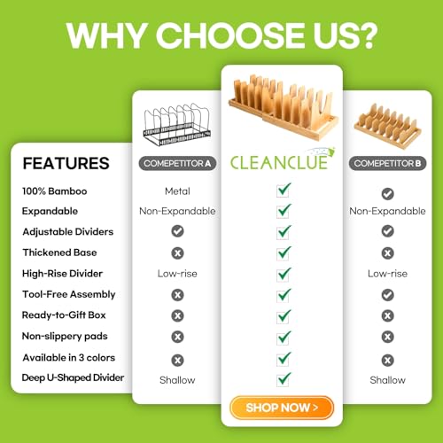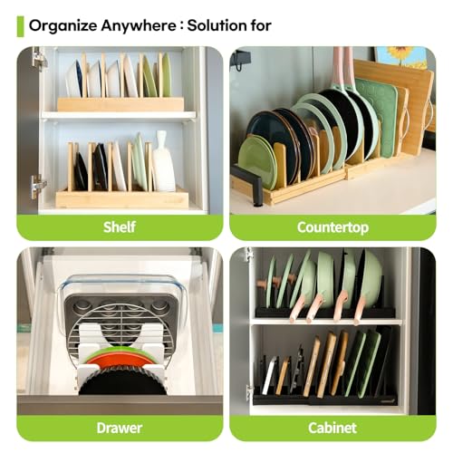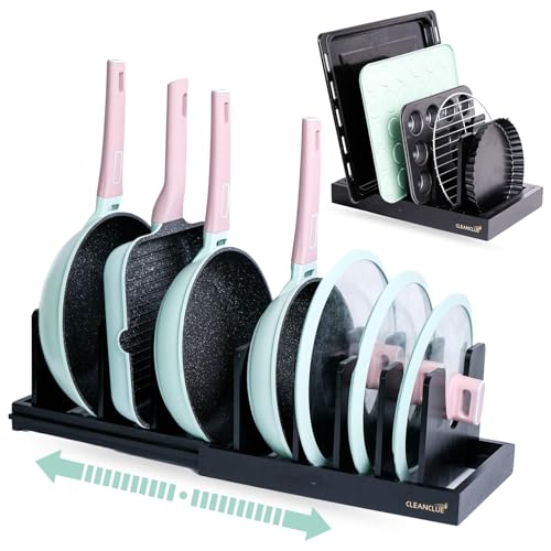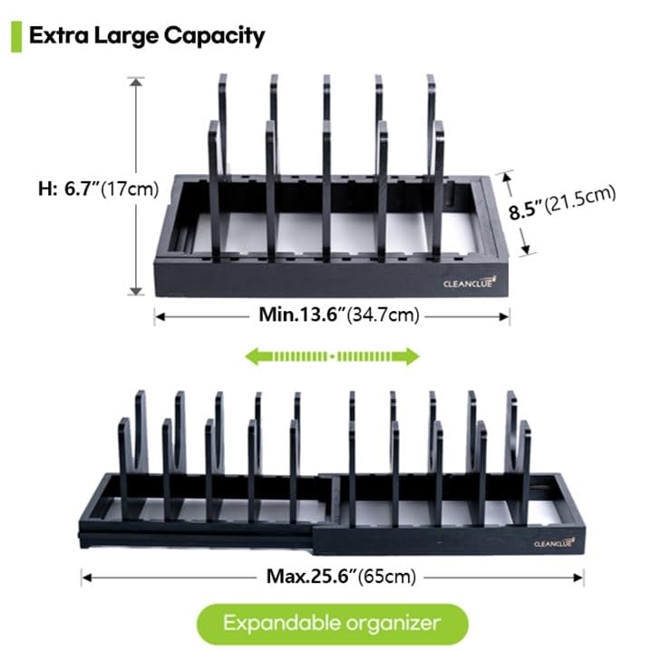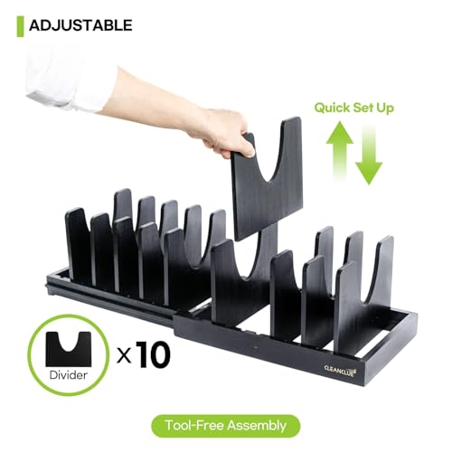 CLEANCLUE - منظم اواني ومقالي من الخيزران قابل للتوسيع كلين كلو للتخزين في المطبخ رف حامل اغطية الاواني للتعديل ادوات الخبز ولوح التقطيع منظمات صينية واوراق البسكويت اسود