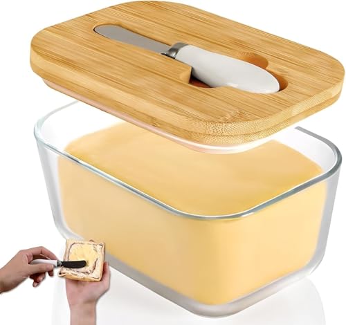 Generic - طبق زبدة من الخيزران والزجاج - تخزين محكم مع سكين مدمج، مثالي لحفظ الزبدة الطازجة على أسطح الطاولات أو في الثلاجات