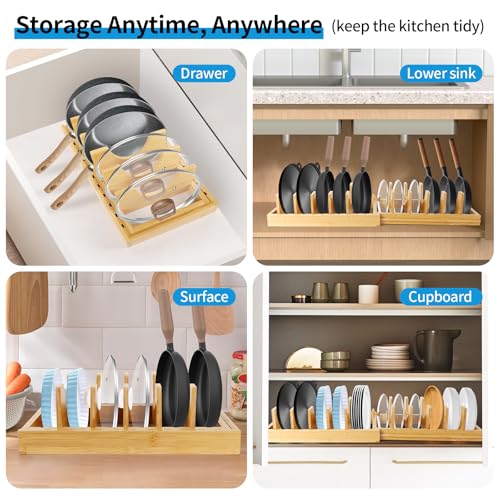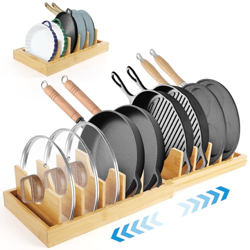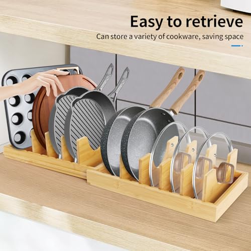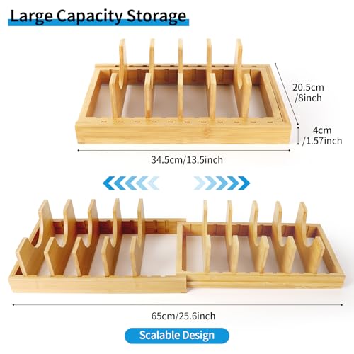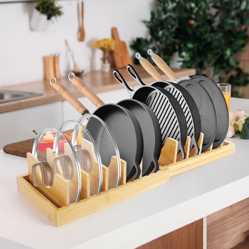 Lbwstellar - منظم اغطية اواني الخيزران مع 10 فواصل قابلة للتعديل - رف تخزين خشبي قابل للتوسيع، حامل غطاء لاغطية الاواني والمقالي وألواح التقطيع والاطباق، منظم خزانة للمطبخ
