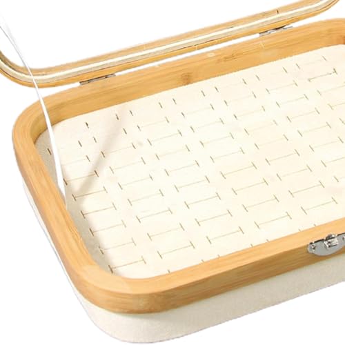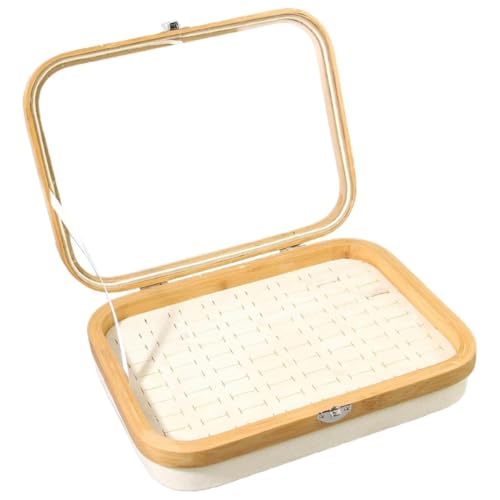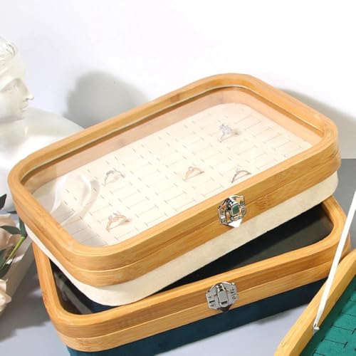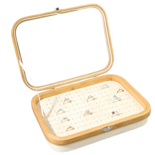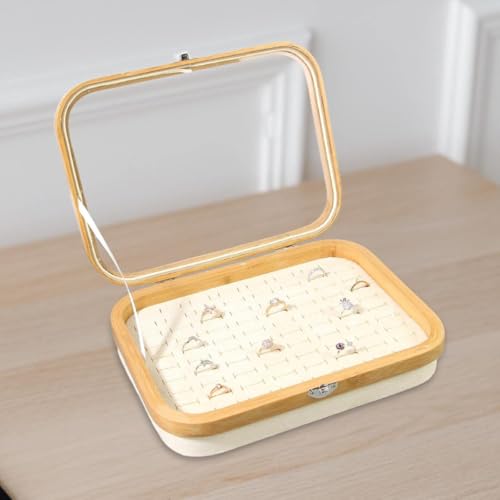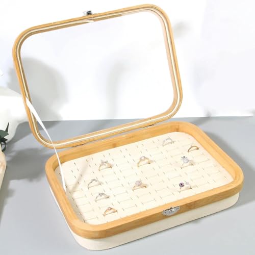 Generic - صندوق منظم للخواتم والمجوهرات من الخيزران مع غطاء زجاجي - 76 فتحة، بيج