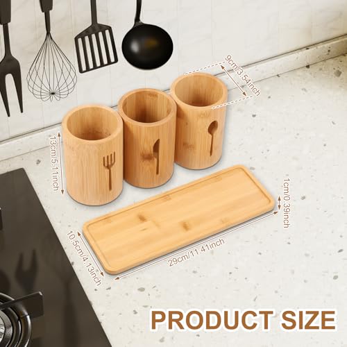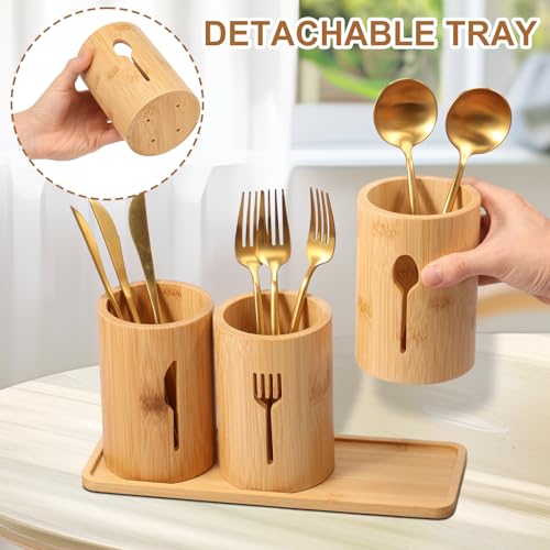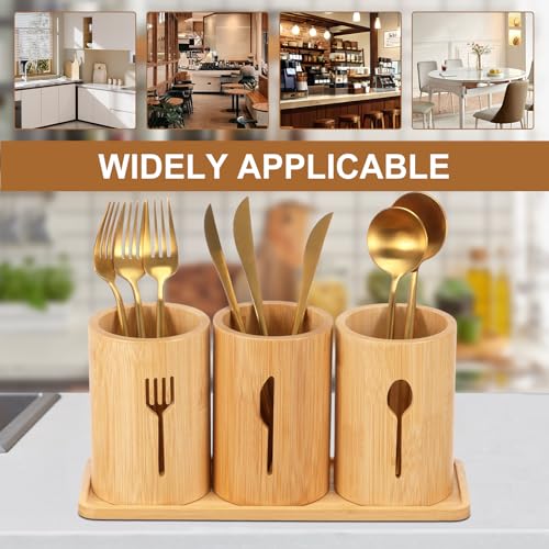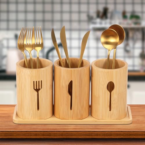 GLMFAN - حامل ادوات المائدة الفضية من الخيزران لحمل ادوات المطبخ والسكين والملاعق والشوك وادوات المائدة الفضية مع فتحة تصريف و3 اقسام لتخزين ادوات المائدة للحفلات على سطح الطاولة