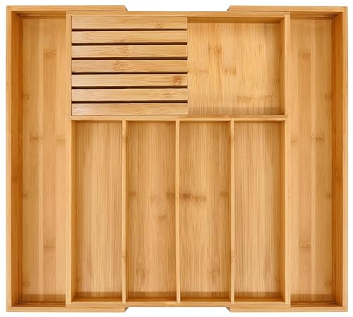 Generic - منظم ادوات المائدة الفضية من الخيزران - صينية درج قابلة للتوسيع مع حامل سكاكين قابل للازالة ومقصورات مقسمة لادوات المائدة والملاعق والشوك والسكاكين في تخزين المطبخ
