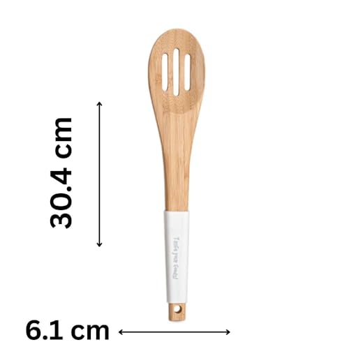 Generic - ملعقة مطبخ من الخيزران، بفتحات ومقبض سيليكون للإمساك بها، مثالية لتصفية السوائل الزائدة،ورفع الطعام من الصلصات أو الشوربات، 30.4 × 6.1 × 1.6 سم. لون أبيض
