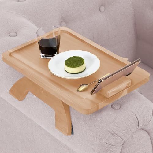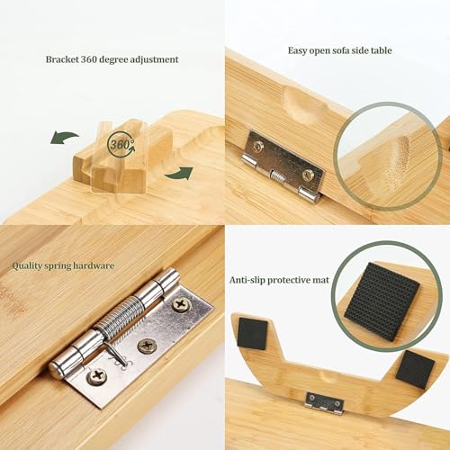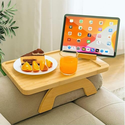 Wenrecu - طاولة بذراع اريكة من الخيزران مع حامل متحرك دوار، تصميم بمشبك قابل للطي للارائك، صينية مسند ذراع قابلة للطي لتناول الطعام والشرب