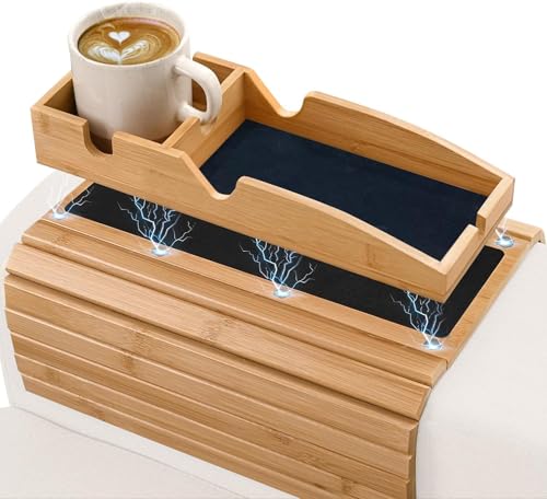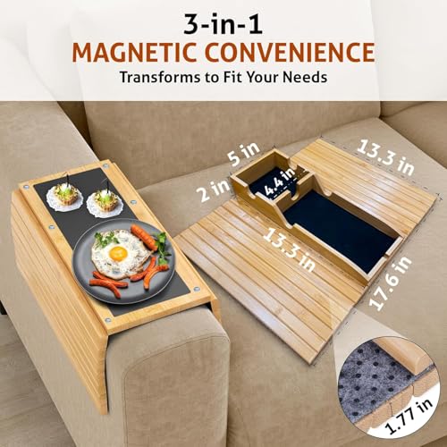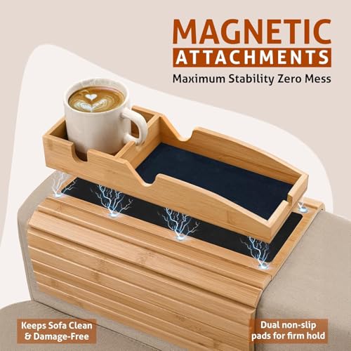 Daily Favorites - صينية مسند ذراع الكنبة من الخيزران - صينية ذراع الكنبة المغناطيسية 3 في 1 مع حامل اكواب للاريكة قابل للفصل - حامل جوال ووسادة مضادة للانزلاق - منظم للوجبات الخفيفة واجهزة التحكم عن بعد والمشروبات