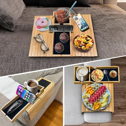 - طاولة مريحة لمسند ذراع الأريكة: صينية ذراع الأريكة المصنوعة من الخيزران هي رفيقك المثالي لليالي الأفلام المريحة أو الأمسيات المريحة. مصممة للحفاظ على كل ما تحتاجه - المشروبات والوجبات الخفيفة وأجهزة التحكم عن بعد والهواتف وغيرها - في متناول اليد، تضمن لك صينية ذراع الأريكة الاستمتاع ببرامجك المفضلة دون انقطاع. قل وداعًا لأجهزة التحكم عن بعد في غير مكانها ومتاعب موازنة الوجبات الخفيفة أو المشروبات.
