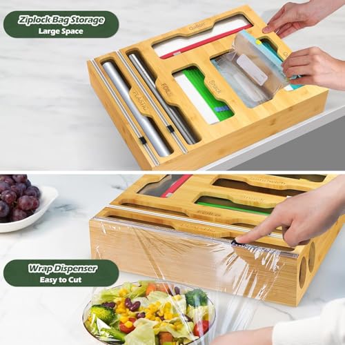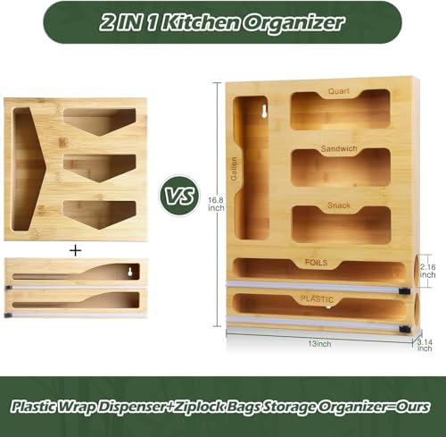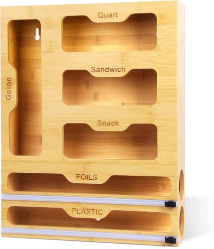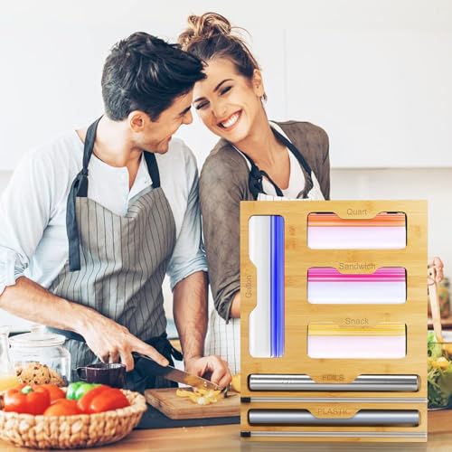 - تصميم موفر للمساحة: منظم عمودي قابل للتثبيت على الحائط يخزن أكياس تخزين الطعام ولفائفه بكفاءة مع زيادة مساحة المطبخ