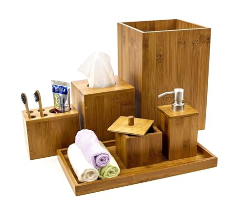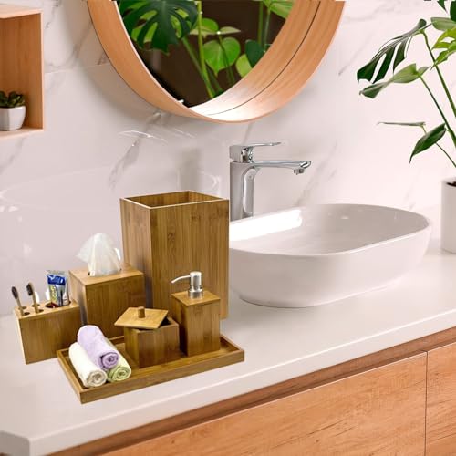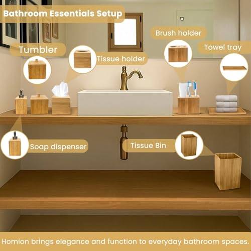 HOMION - اكسسوارات حمام من الخيزران تتضمن موزع صابون وحامل صابون وحامل فرش أسنان وصينية للمرحاض، مجموعة حمام صغيرة الحجم بلون طبيعي، 6 قطع