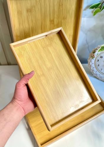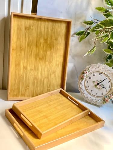 - مجموعة صواني الخيزران الأنيقة المكونة من 3 قطع: تتضمن ثلاثة صواني متعددة الاستخدامات بمقاسات 39 × 29 سم و33 × 23 سم و28 × 20 سم. مثالية لتقديم الطعام أو المشروبات أو عرض العناصر الزخرفية في أي مكان منزلي.