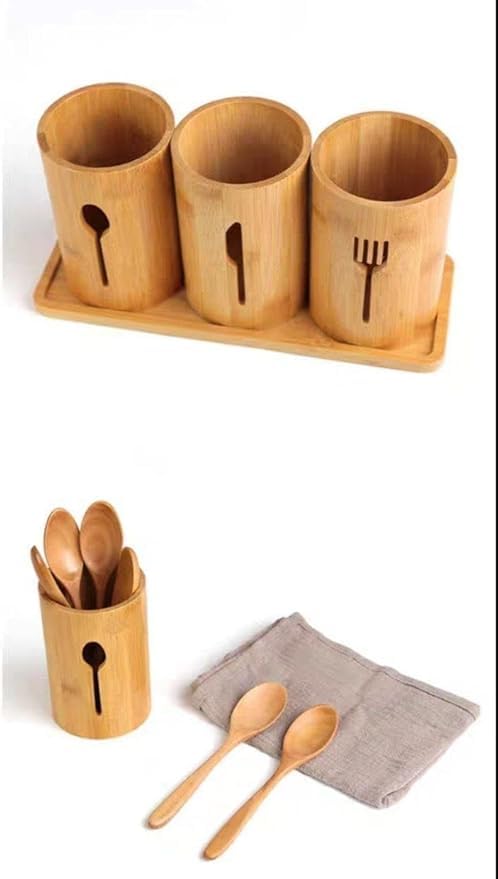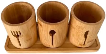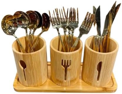 - تصميم أنيق: حامل أدوات من الخيزران بثلاثة أقسام، مزين بنقوش شوكة وملعقة وسكينة لتنظيم سهل وجاذبية بصرية.