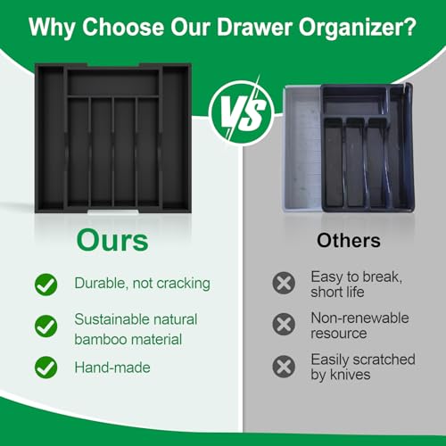 - منظم أدراج قابل للتوسيع: مقسم إلى 7 مساحات تخزين، اكتشف أقصى سعة وراحة مع مقسم أدوات المائدة المصنوعة من الخيزران. منظم أدوات المائدة المتين والأنيق هو أداة تنظيم مثالية لأي غرفة. يتيح لك نسيان الشعور الفوضوي.