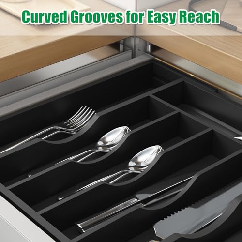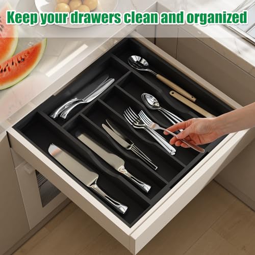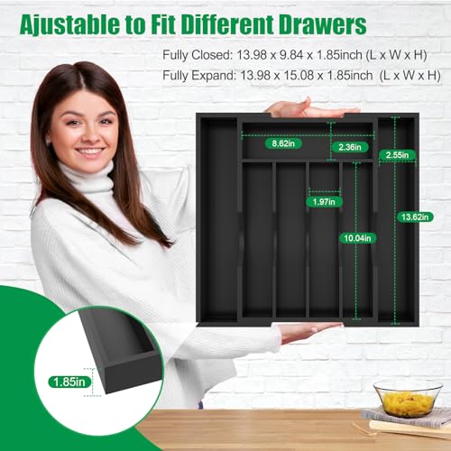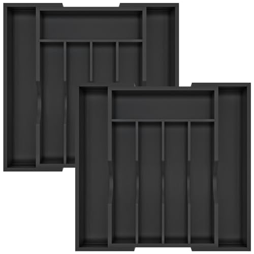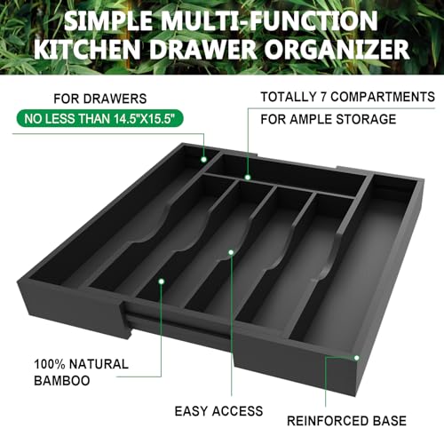 BAMBUROBA - بامبوروبا منظم درج المطبخ من الخيزران ادوات فضية قابل للتوسيع عبوتان حامل المائدة وصينية مع 7 فتحات مقسم تخزين الادوات اسود