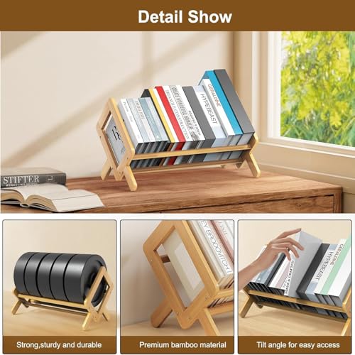 Baoly - منظم رف كتب مكتبي من باولي، رف كتب مائل للمساحات الصغيرة، رف كتب لسطح الطاولة، خزانة كتب مكتبية، رف تخزين للاقراص المضغوطة/المجلات/الكتب (خيزران)
