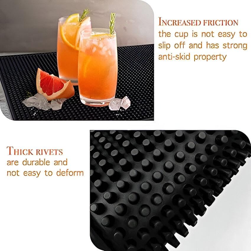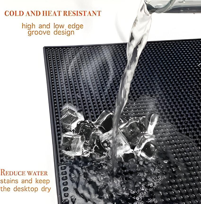 - البساط مصنوع من مادة مطاطية عالية الجودة، مما يوفر مقاومة ممتازة للحرارة، مما يجعله خيارًا مثاليًا للحانات والمطابخ ذات الازدحام الشديد حيث يتم التعامل مع الأواني الزجاجية الساخنة والأكواب والمشروبات الأخرى.