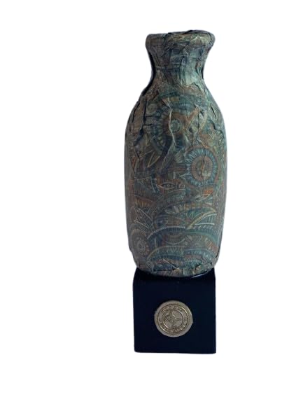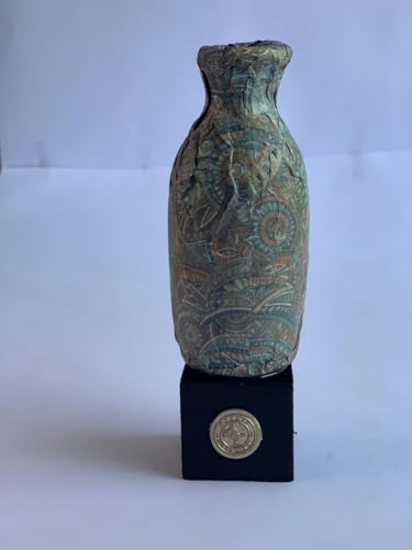 Generic - فازة فخار متوسطة الحجم مصنوعة يدويا بتصميم منقوش عتيق مع قاعدة خشبية، تحفة للديكور المنزلي، فازة من الفخار المصري من بارتي ارت