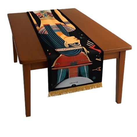 Generic - مفرش طاولة بتصميم شخصية فرعونية بنقش إله قديم درامي بخلفية سوداء من قماش فاخر مزين بشراشيب لديكور أنيق من باراتي ارت، مقاس 1.80 م × 32 سم
