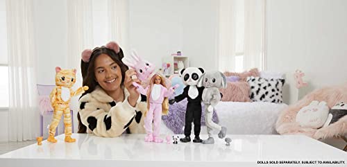 Barbie - عروسة كيوتي ريفيل ترتدي زي تنكري من القطيفة بتصميم باندا مع 10 مفاجات تتضمن حيوان اليف صغير ولون متغير هدية للاطفال بعمر 3 سنوات فما فوق باربي