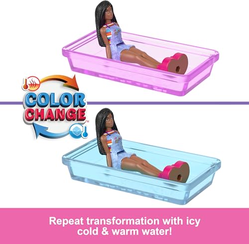 Barbie - مجموعة عروسة ومركبة عروسة صغيرة باربي لاند، عروس باربي مقاس 4 سم ومركبة دريم كامبر مع أبواب قابلة للعمل وحمام سباحة متغير اللون من باربي