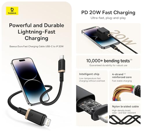 Baseus - كابل شحن سريع متين من USB نوع سي إلى لايتنينج 20 وات ونقل بيانات 480 ميجابت في الثانية لآبل آيفون 14 برو ماكس، 13، 12، 11، X XS، XR، X، 8 بلس، 7، 6 S وايباد من سلسلة سوبر فلاش من باسيوس، 2 متر، ذهبي