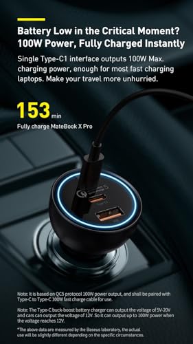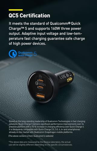 Baseus - باسيوس شاحن سيارة 160 واط فائق السرعة مع 3 مخارج | كيو سي 5.0، بي دي 3.0 | للجوال والتابلت واللابتوب | يتضمن كيبل USB-C 100 واط | لابل ايفون وايباد وسامسونج S25 الترا والمزيد