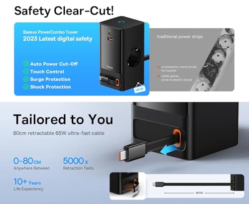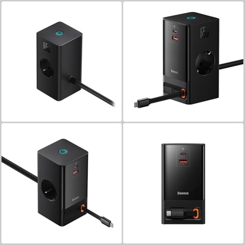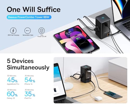Baseus - شاحن كمبيوتر مكتبي GaN5 برو 65 واط 5 في 1 باور كومبو تاور PD3.0 QC4.0 مع 5 أجهزة في وقت واحد، سلك بطول 1.5 متر 2AC + 1U + 1C + كيبل USB-C قابل للسحب للمنزل والمكتب من باسيوس